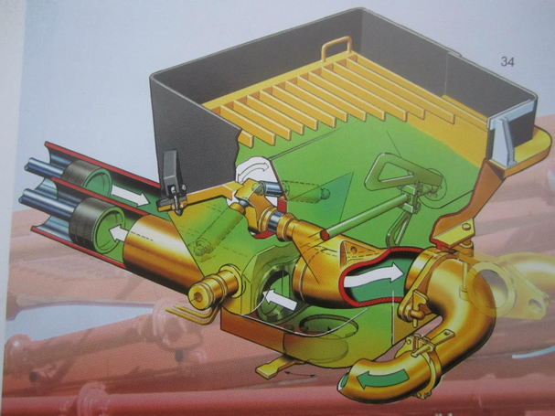 泵送機(jī)構(gòu)由兩只主油缸、水箱、換向裝置、兩只混凝土缸、兩只混凝土活塞、料斗、分配閥(又稱S管)、擺臂、兩只擺動(dòng)油缸和出料口組成。