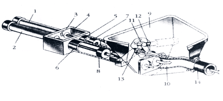 (1)(2)主油缸;(3)水箱; (4)換向裝置;(5)(6)混凝土缸; (7)(8)混凝土活塞 ;(9)料斗;(10)分配閥 ;(11)擺臂; (12)(13)擺動(dòng)油缸;(14)出料口