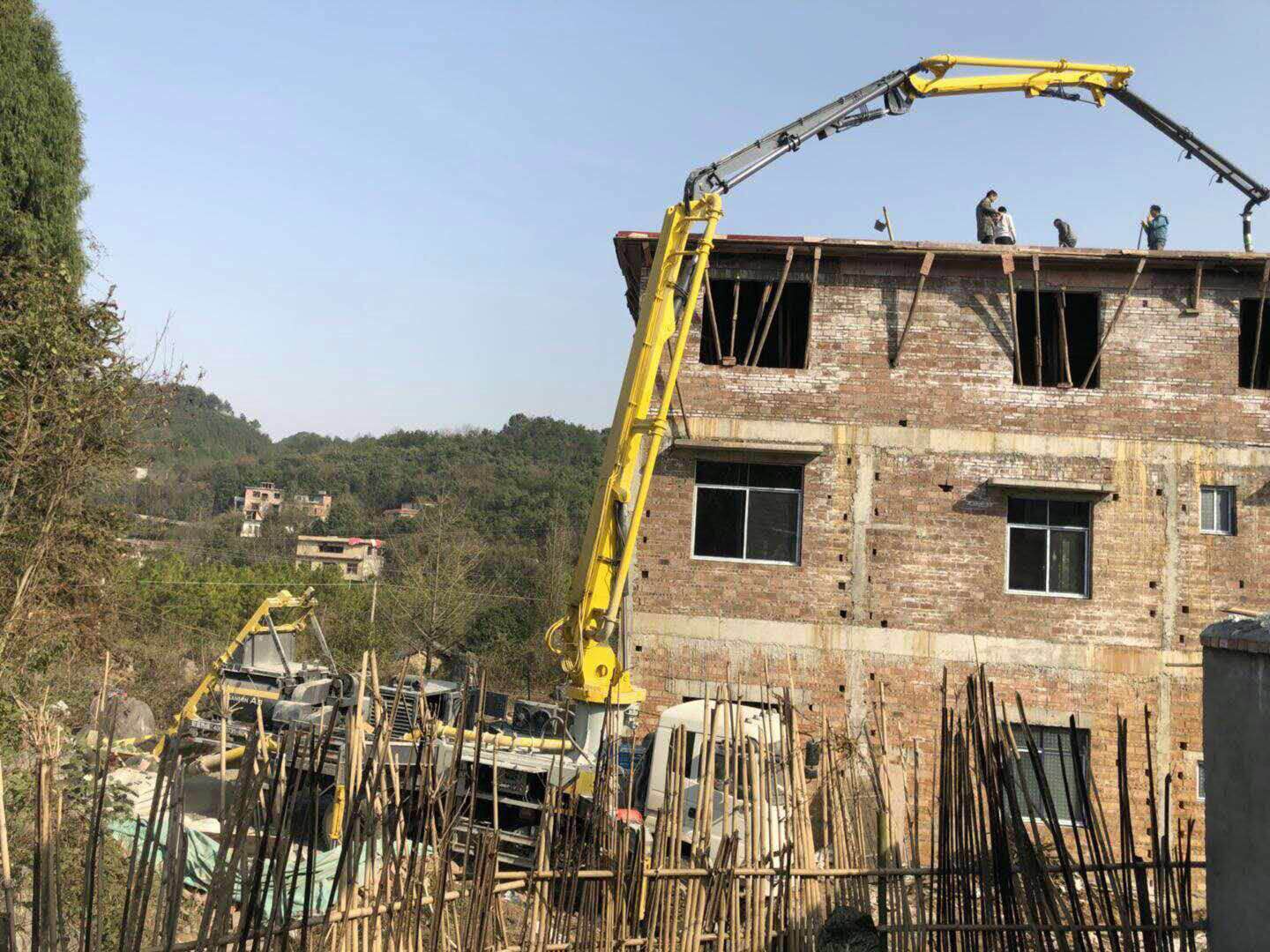 這是一種比較棘手的問(wèn)題,也是泵車緊急故障中難以處理的一種。首先看是否是燃油缺乏或者燃油濾芯堵塞的原因,30分鐘-60分鐘內(nèi)修復(fù)即可。如果不是就比較麻煩了,需撥打三民重科技術(shù)人熱線:400-0731-606等待緊急救援。等待救援過(guò)程中,可先將蓄能器卸荷截止閥打開(kāi),釋放蓄能器管路中壓力。在打開(kāi)混凝土料斗下面的排放閥,放掉混凝土。另外用水沖洗料缸和 S 閥。待該料缸沖洗干凈后,松開(kāi)S 閥小軸上調(diào)節(jié)切割環(huán)間隙的大螺母,卸掉兩個(gè)擺缸上的高壓管,利用撬棍或者鋼管將 S 閥推向已經(jīng)沖洗干凈了的料缸一邊,直至將仍然有混凝土的另外一個(gè)料缸露出口來(lái),然后進(jìn)行高壓水沖洗,清除該料缸內(nèi)的混凝土。救援泵車到達(dá)之后,打開(kāi)有故障泵車的變徑管和水平管連接的部位,在水平管內(nèi)塞入濕過(guò)水的海綿球;卸下救援泵車的尾膠管,將救援泵車布料桿上的后一個(gè)彎管和故障泵車的水平管連接起來(lái),救援泵車的料斗內(nèi)注滿水,然后救援泵車進(jìn)行泵送,利用救援泵車將故障泵車輸送管內(nèi)的混凝土泵排除出去,消除混凝土凝固的危險(xiǎn)。在兩個(gè)泵車連接之前,必須首先將救援泵車輸送管內(nèi)的混凝土排除出去。