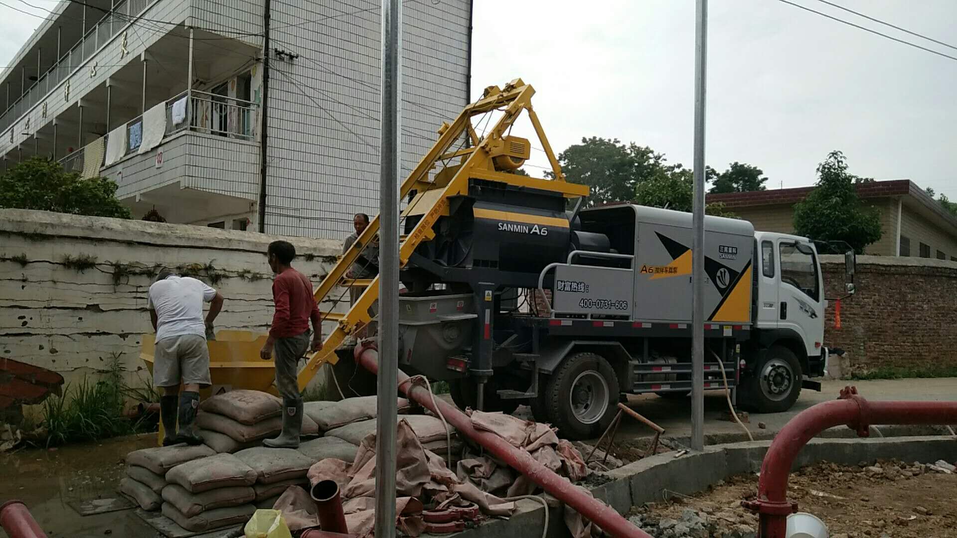 2016年7月,“尼伯特”臺風給閩清塔莊鎮(zhèn)帶來特大暴雨洪災后,三民重科混凝土泵車之攪拌車載泵在援建一線參與災后重建。