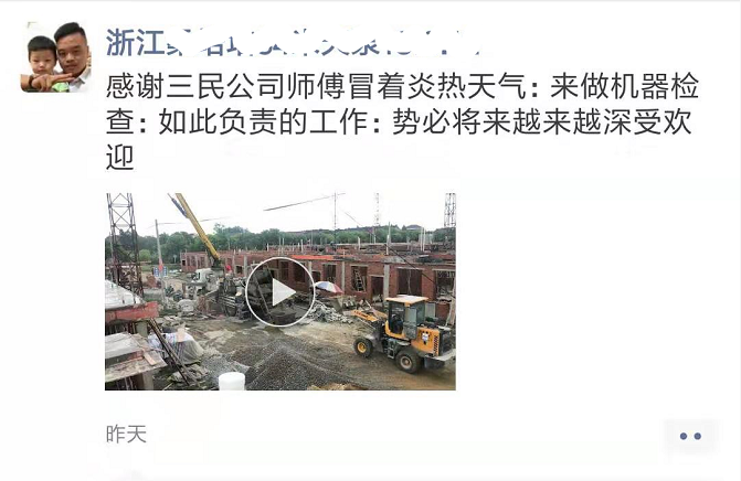 你看,在江西會(huì)昌,三民的服務(wù)工程師鉆進(jìn)底盤(pán)下,雖然地表的溫度與機(jī)器的溫度交織在一起,熱浪滾滾,但他們依舊認(rèn)真地檢修著設(shè)備的每一個(gè)部位;在廣東大埔,“草帽哥”呈現(xiàn)的不僅是客戶的認(rèn)可,更是他們執(zhí)著的付出;在福建莆田,他們不忘利用檢修過(guò)程中的閑碎時(shí)間,教導(dǎo)客戶如何判斷遙控器故障;在浙江嘉興,他們爬上轉(zhuǎn)塔,每一個(gè)螺栓、每一根油管,都在仔細(xì)地檢查著,而客戶自發(fā)豎起的大拇指,就是對(duì)他們工作最好的認(rèn)可與回報(bào)。
