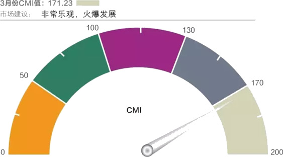 2017年3月份中國工程機(jī)械市場指數(shù)即CMI為171.23,同比增長25.66%,環(huán)比增加57.66%。2017年3月份中國工程機(jī)械市場指數(shù)比上月提高62.62點(diǎn),比上年同期提高34.97點(diǎn),同比、環(huán)比繼續(xù)增長,而且也創(chuàng)下了2011年7月CMI指數(shù)創(chuàng)立以來的高值。