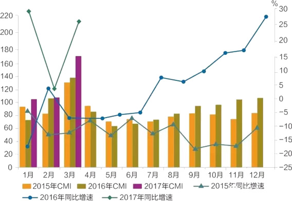 2015年-2017年CMI指數(shù)及同比增速變化趨勢