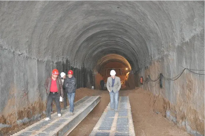 隧道混凝土是采取邊開挖邊襯砌的方式完成的。開挖后先用噴射混凝土作為初期支護(hù),之后搭設(shè)鋼筋網(wǎng),用毛桿固定鋼筋網(wǎng)。之后才可以進(jìn)行二襯。