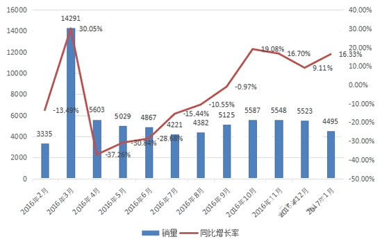 工程機(jī)械行業(yè)的回暖帶動裝載機(jī)銷量大增,前瞻產(chǎn)業(yè)研究院發(fā)布的《中國裝載機(jī)行業(yè)產(chǎn)銷需求與投資預(yù)測分析報(bào)告》統(tǒng)計(jì)顯示,2017年1月份國內(nèi)25家主要裝載機(jī)生產(chǎn)企業(yè)合計(jì)銷售各類裝載機(jī)共計(jì)4495臺,同比大增16.33%。