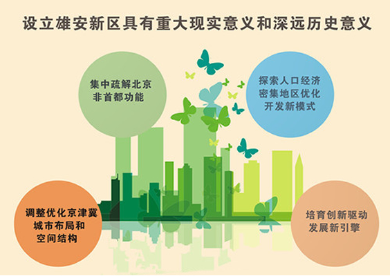 中共中央決定設(shè)立雄安新區(qū):設(shè)立雄安新區(qū)的戰(zhàn)略目標(biāo)是疏覽北京非首都功能,探索人叔經(jīng)濟(jì)密集地區(qū)優(yōu)化開(kāi)發(fā)新模式,將在河北適合地段規(guī)劃建設(shè)一座以新發(fā)展理念引領(lǐng)的現(xiàn)代新型城區(qū)。新區(qū)定位綠色智慧新城,打造伓美生態(tài)環(huán)境,發(fā)展高端高新產(chǎn)業(yè),提供優(yōu)質(zhì)公共服務(wù),構(gòu)建快捷高效交通網(wǎng),推進(jìn)體制機(jī)制改革,擴(kuò)大全方位對(duì)外開(kāi)放。